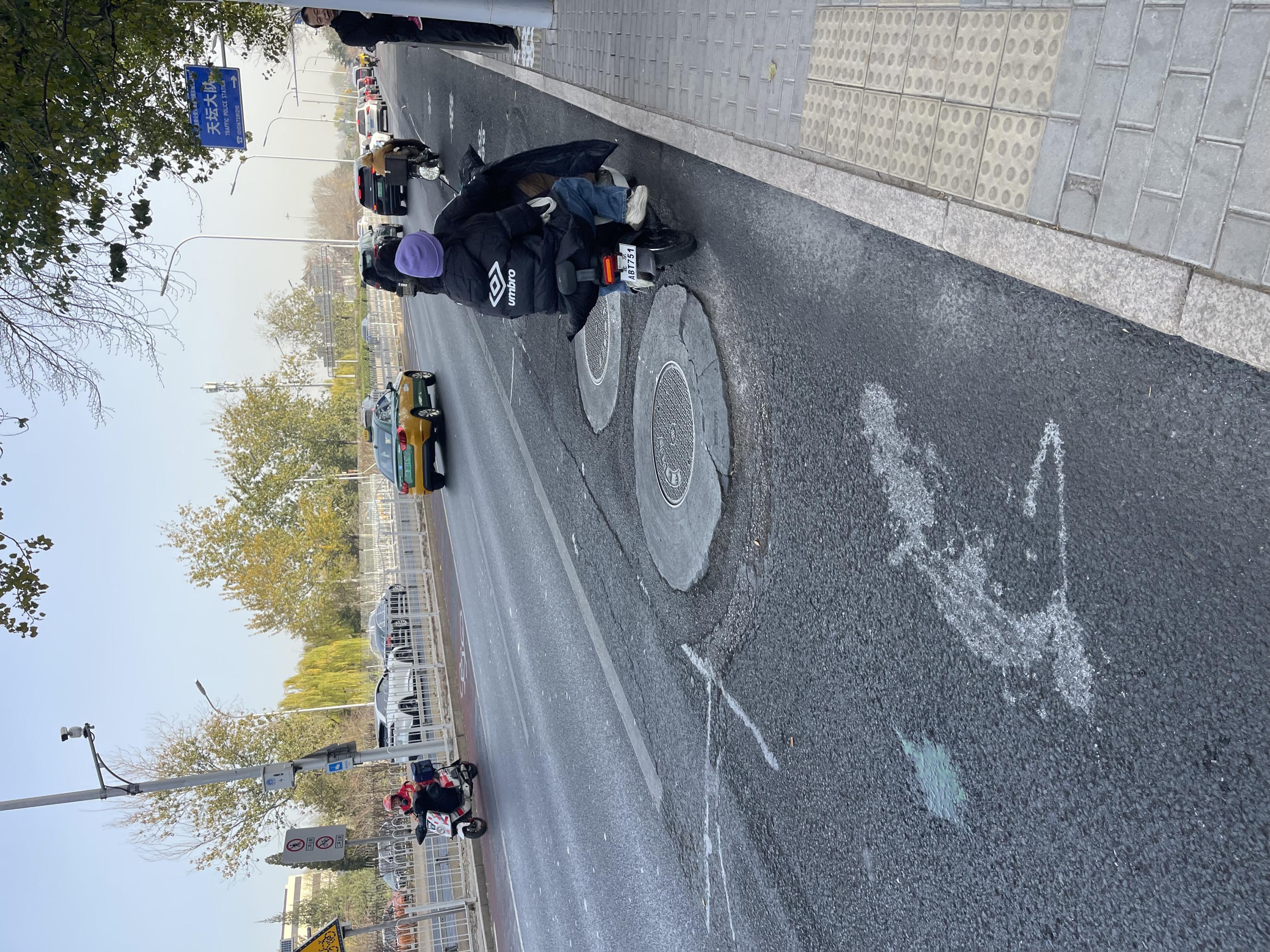 永定门西公交站前路面井盖凸出,骑车东谈主只可绕着走。
